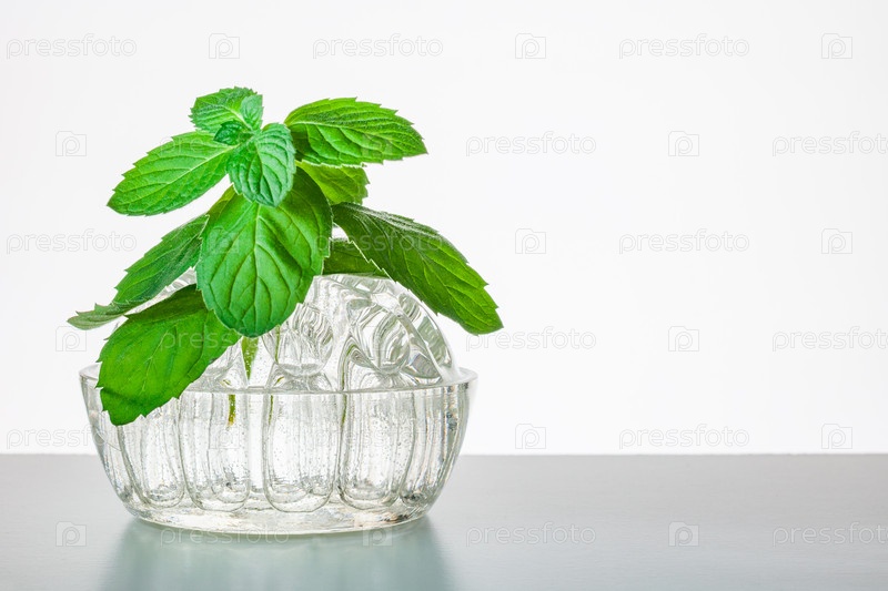 Мятные листья в стеклянной вазе на белом фоне