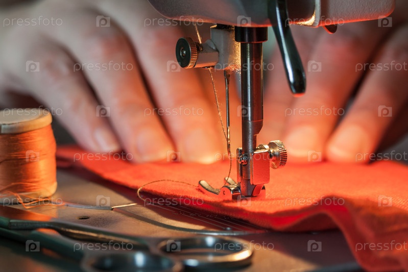Костюмный процесс - женские руки за ее шитьем, рядом лежит скин нитей и ножниц