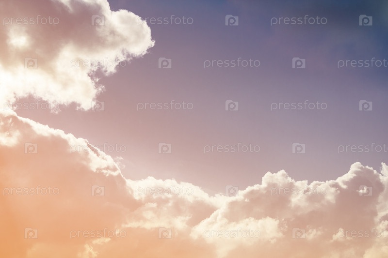 Пушистые облака, освещенные солнечным светом в небе (фон, тонированный, копировальное пространство)