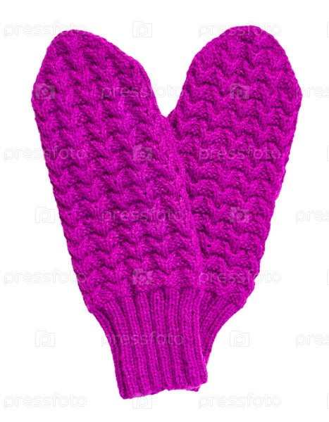 Фиолетовые вязаные рукавицы в виде сердца, изолированного на белом фоне