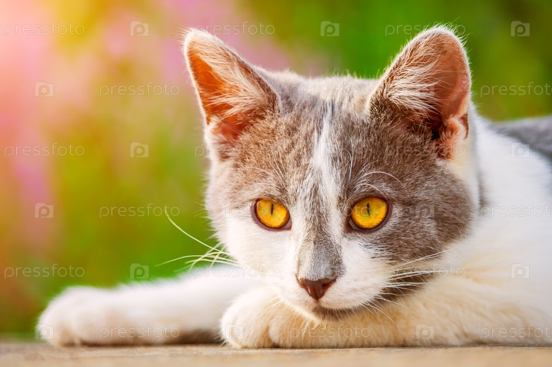 Портрет серо-белого котенка с ярко-оранжевыми глазами, освещенными солнечным светом на фоне цветущих растений в боке (тонированный)