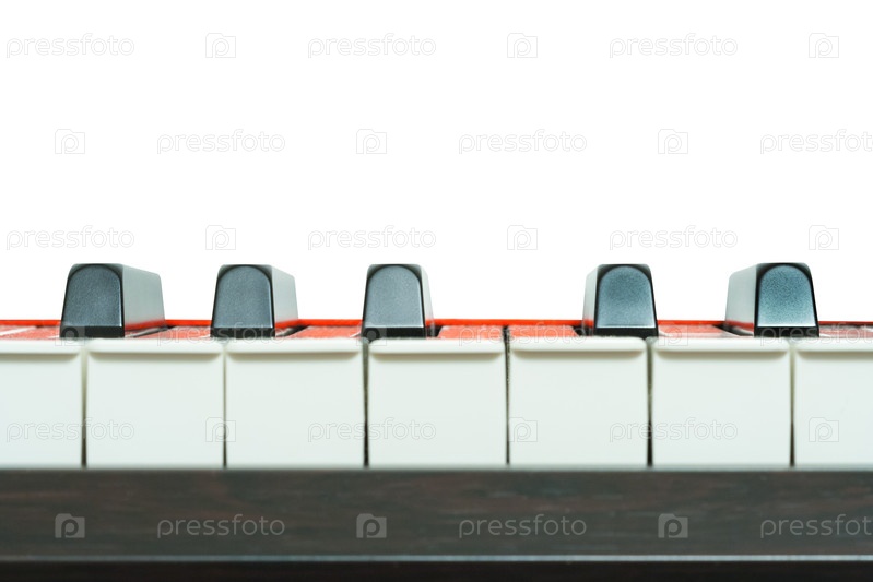 Фортепианные клавиши вид спереди на белом фоне, крупным планом