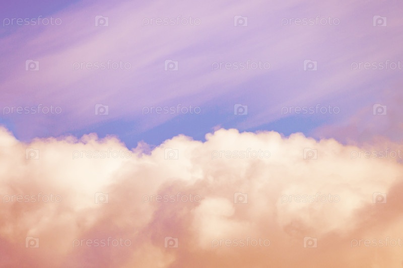 Оранжевые пушистые облака, освещенные солнечным светом на мягко розовом фоне неба (тонированный)