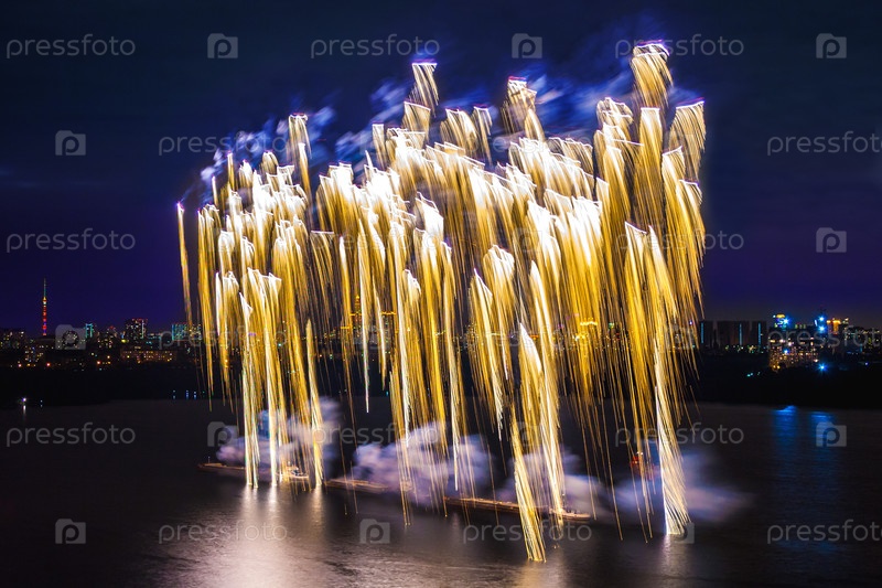 Золотой фейерверк над водой на темном фоне неба