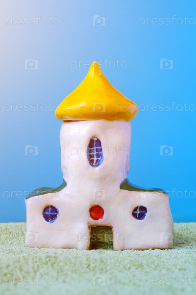 Миниатюра, сделанная вручную ребенком, керамическая церковь на зеленом фоне, на фоне синего неба с солнечным светом