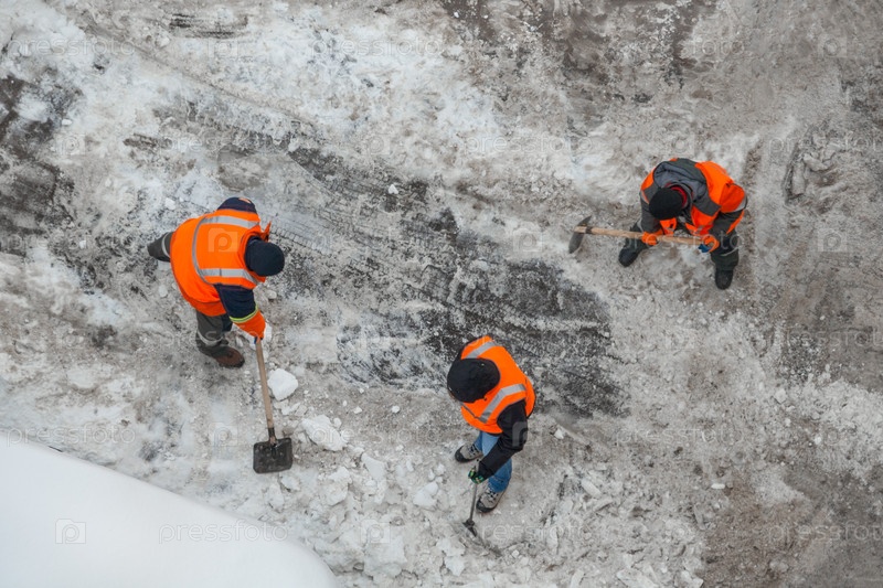 Вид сверху на рабочих, убирающих лопату грязной дороги