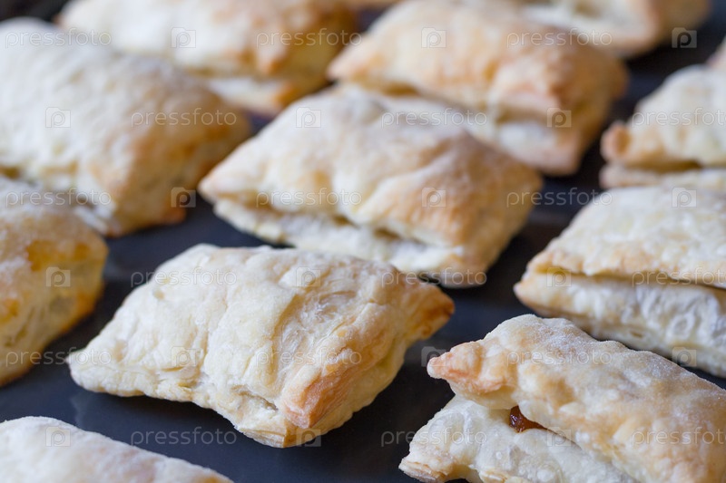 Закрытый вид свежеиспеченных пирогов из затяжной выпечки на выпечке (небольшая глубина резкости)