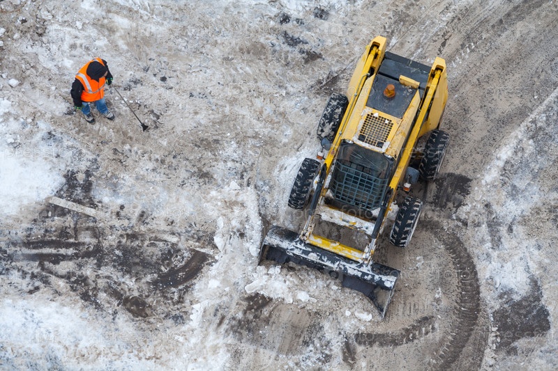 Вид сверху снегоуборочной машины и рабочего в оранжевой форме на грязной дороге