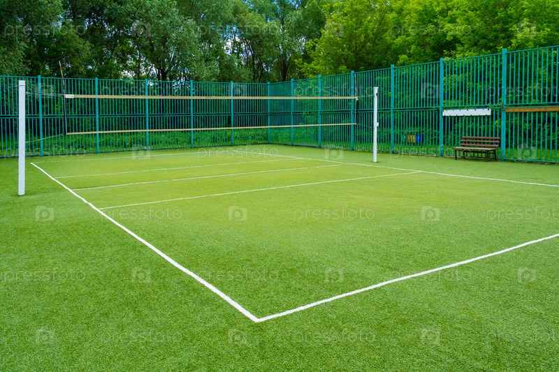 Спортивная площадка в парке с искусственной травой и растянутой сетью на фоне зеленых деревьев