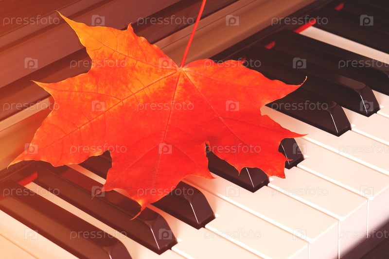 Закрыть вид на осенний красный лист на клавишах фортепиано (фон, концепт, тонированный)