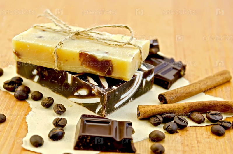 Мыло самодельное с шоколадом на бумаге и доске