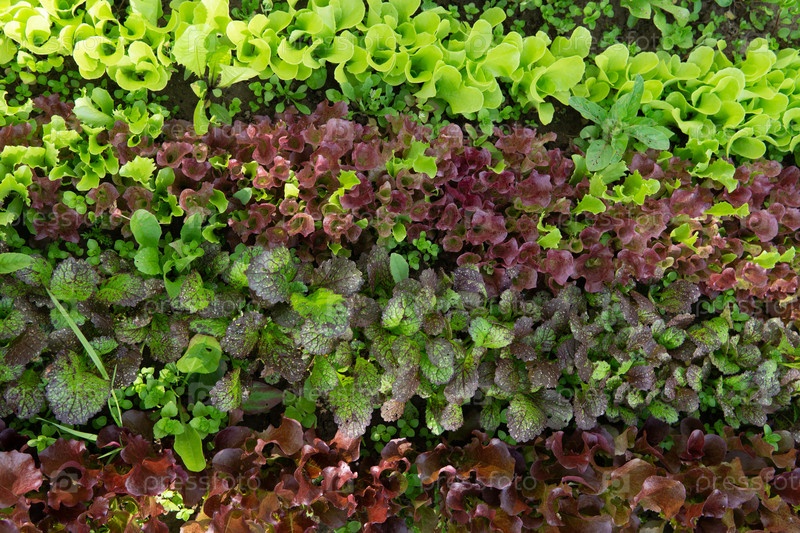 Ряды салата и горчицы разных цветов в садовой кровати