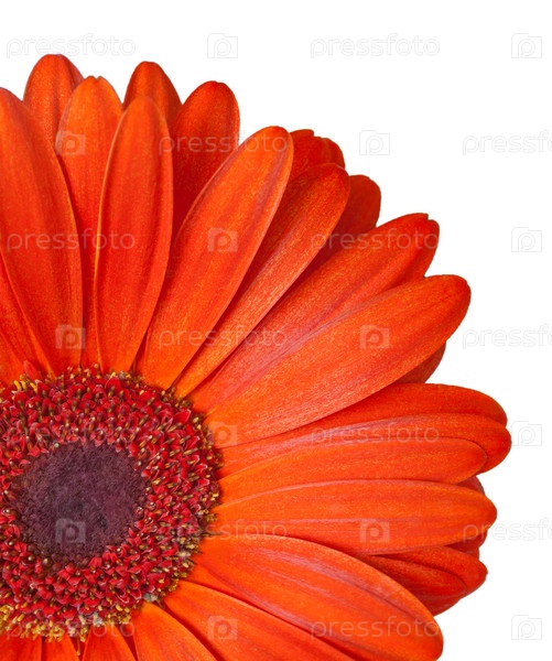 Фрагмент оранжевого цветка гербера выделен на белом фоне. Угловое расположение (абстракт)