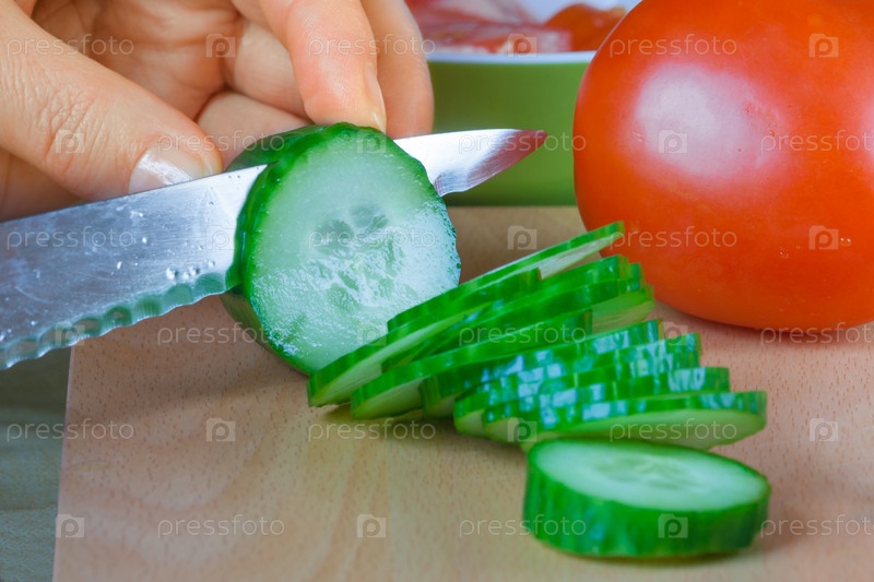 Разрезание женских рук свежими огурцами