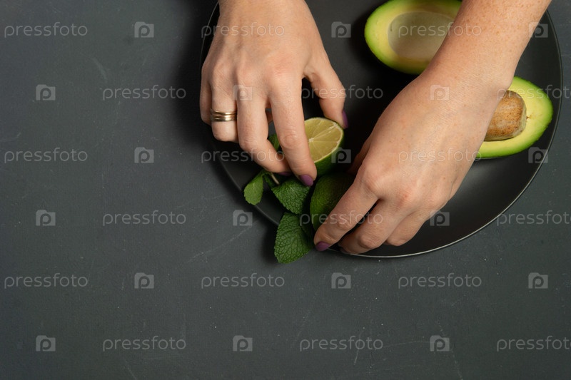 Женщина готовит сырой авокадо и лайм на темном заднем канаве