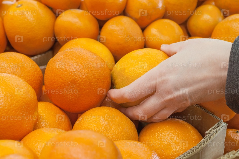 Женская рука выбирает апельсины на рынке
