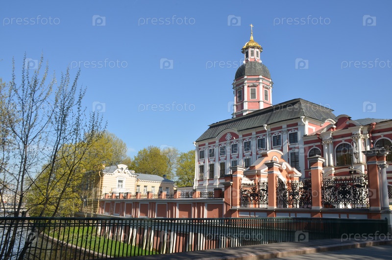 Церковь Благовещения Пресвятой Богородицы (Благовещенская церковь) в Александро-Невской лавре – первый каменный храм в Санкт-Петербурге в стиле петровского барокко на берегу реки Монастырка в весенний солнечный день