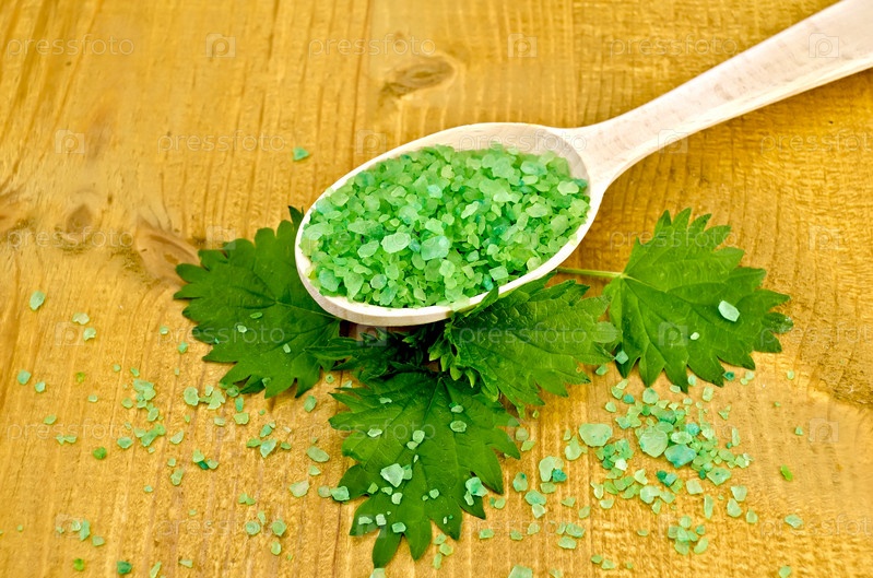 Соль зеленая в ложке с крапивой на доске