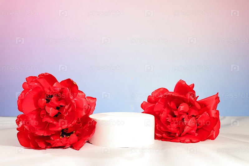 Креативный шаблон для вашего дизайна. Пустой продукт подиум и весенние цветы. Абстрактная цветочная композиция с красными тюльпанами, баннер. Минимальная современная эстетика, элегантная концепция красоты,