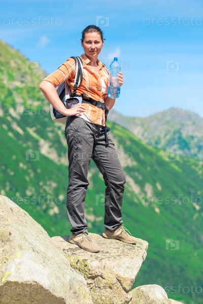 Туристка с рюкзаком женщина с бутылкой воды высоко в горах отдыхает