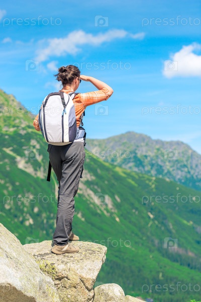 Вид со спины туриста с рюкзаком в горах на скале, глядя на расстояние до гор