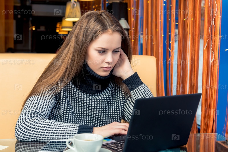 Молодая красивая женщина в кафе работает с ноутбуком и пьет кофе