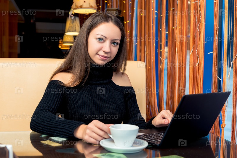 Молодая красивая женщина в кафе работает с ноутбуком и пьет кофе