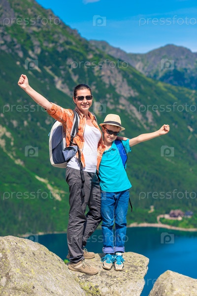 Счастливая мать и сын с рюкзаками высоко в горах на фоне озера Морские Око, Польша