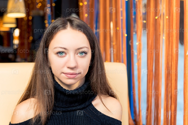 Портрет улыбающейся девушки с выразительными глазами в помещении, крупным планом