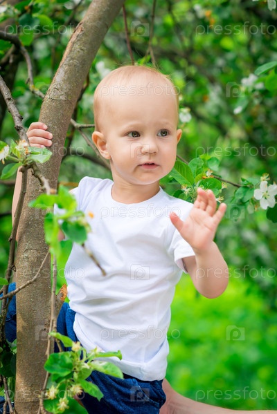 Мальчик в весеннем парке возле дерева