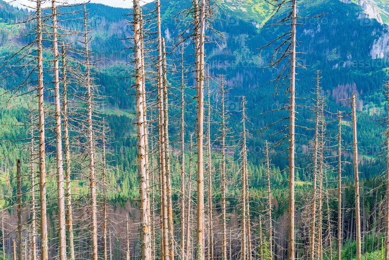 Горизонтальное фото - стволы сухих сосен на фоне гор в солнечный день