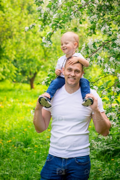 Вертикальный портрет счастливого отца с маленьким сыном в парке на прогулке