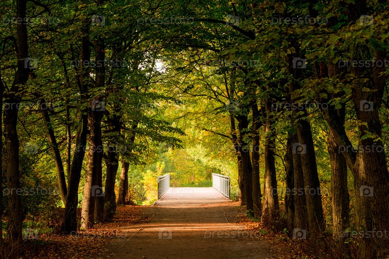 Темная аллея в осеннем парке, вид на деревянный мост через озеро