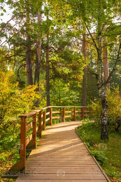 Деревянная тропа в осеннем парке в солнечный октябрьский день