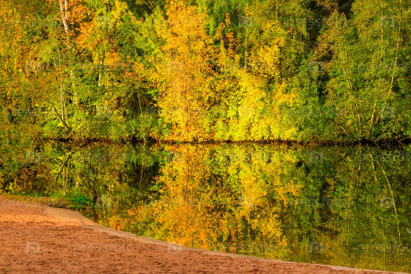 Яркий красивый осенний живописный пейзаж - деревья и озеро в парке