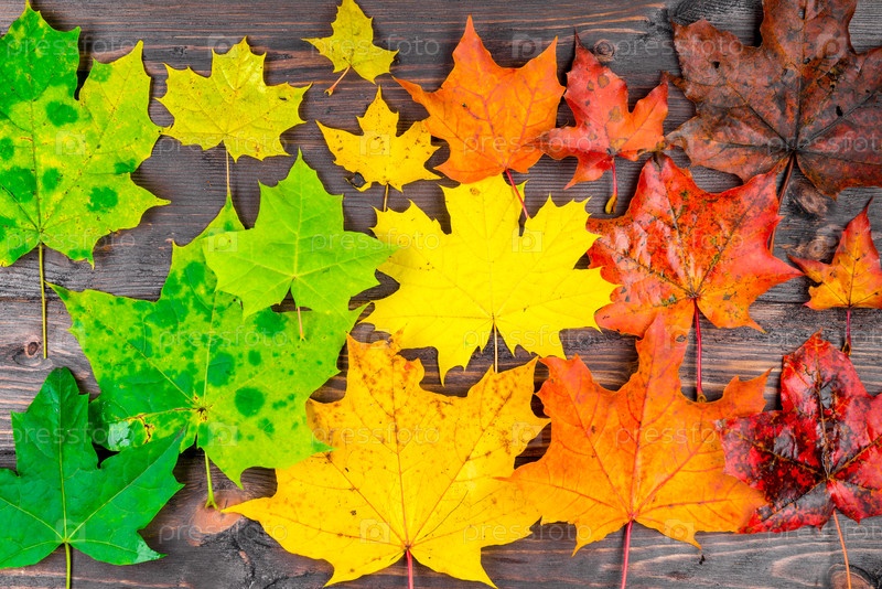Деревянный стол с красивыми осенними кленовыми листьями разных цветов сверху