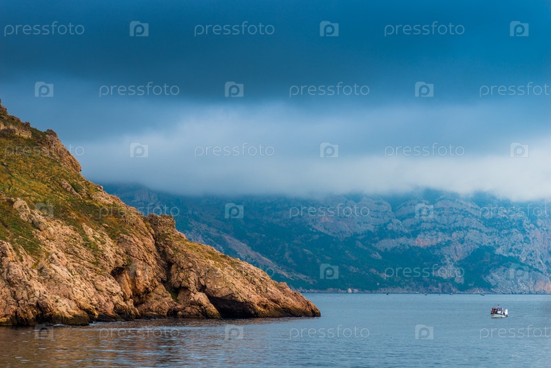 Природный морской пейзаж - скалистое побережье, спокойное море и драматическое небо