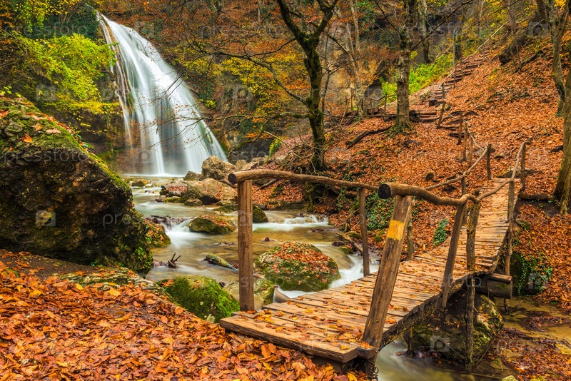 Прекрасный вид на живописный водопад Юр-Юр и старый деревянный мост, осенний Крым, Россия