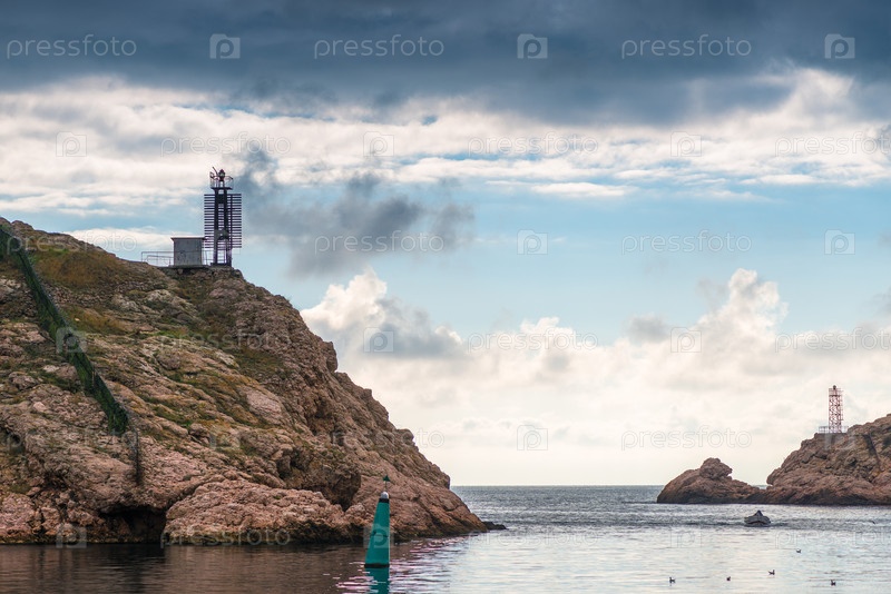 Вход в Бух, покрытый скалами красивый морской пейзаж в пасмурный день, драматическое небо
