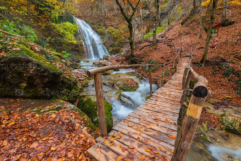 Осенний пейзаж Крыма, знаковый водопад Юр-Юр, на переднем плане моста, Россия