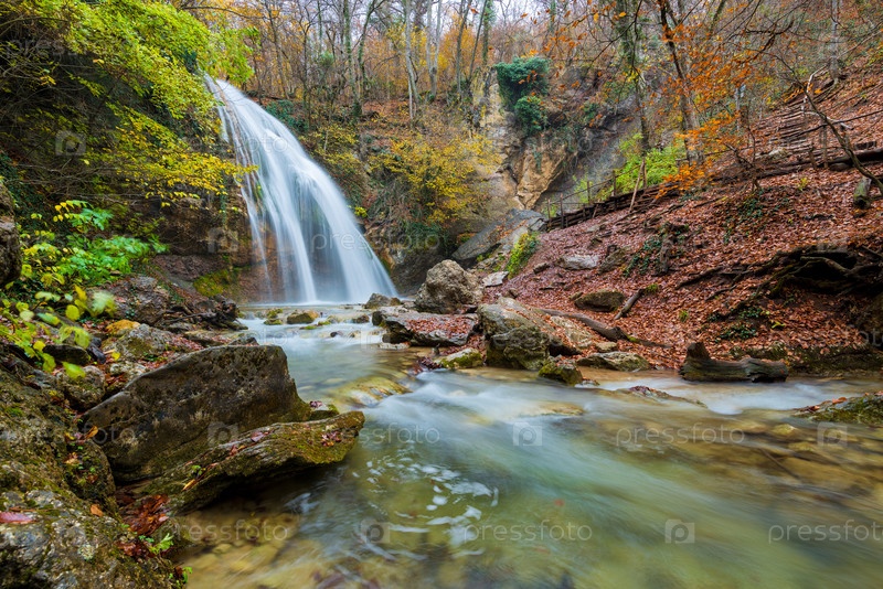 Каньон в горах осенью, вид на живописный водопад Юр-Юр, Республика Крым, Россия
