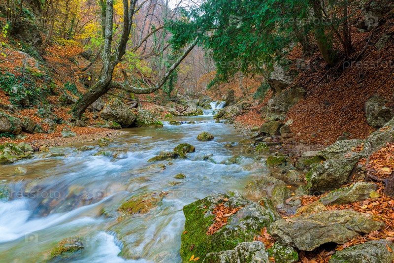 Осенний пейзаж, река, впадающая в ущелье в горах
