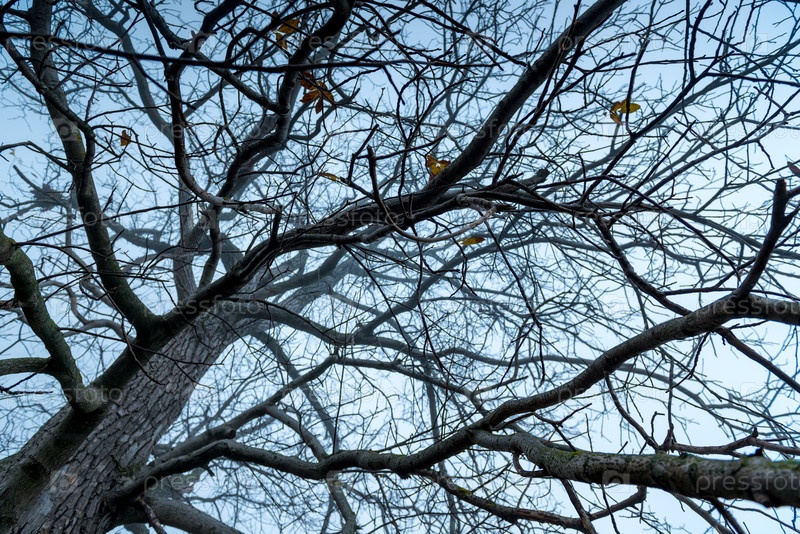 Жаркие ветви большого дерева против осеннего неба в тумане
