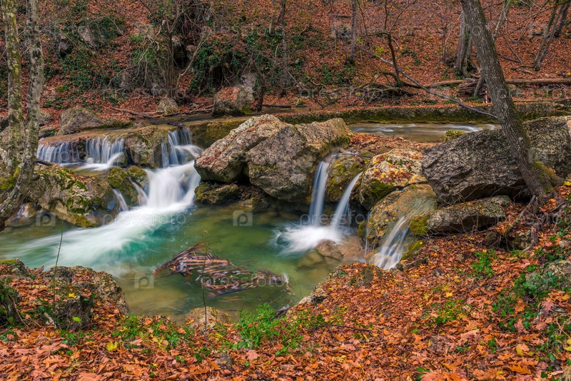 Маленькие водопады и вид на речную открытку в красивом природном месте в осеннем горном лесу