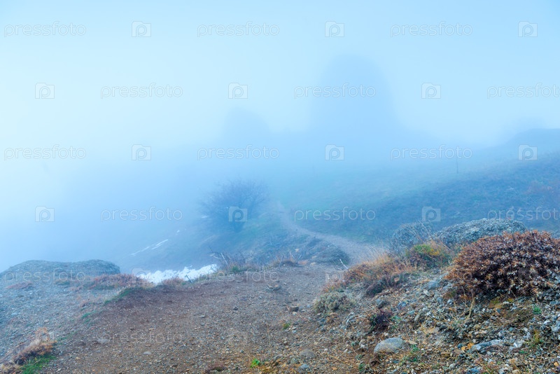 Мрачный осенний пейзаж в туманный день в горах