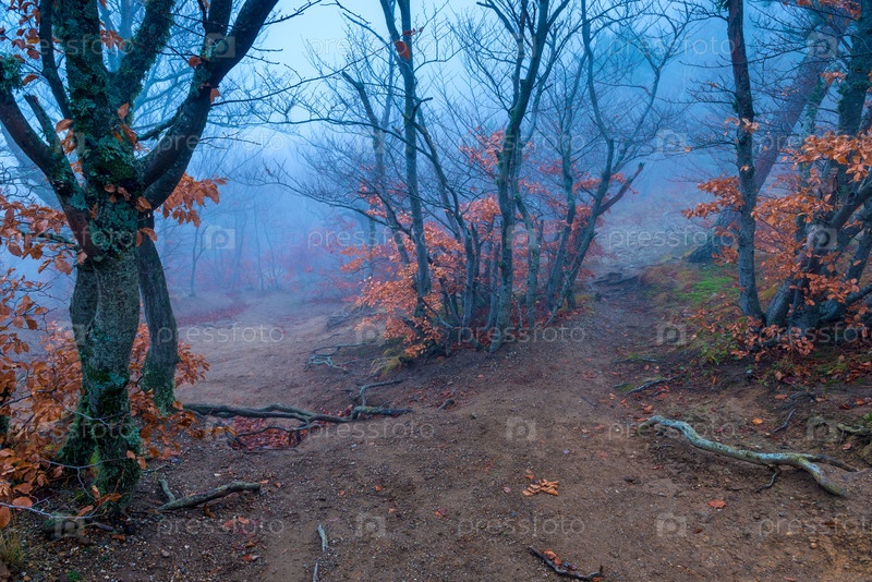 Красивый лес в горах в ноябре, фото в туманное утро