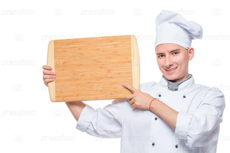 Горизонтальный портрет опытного шеф-повара с разделочной доской на белом фоне