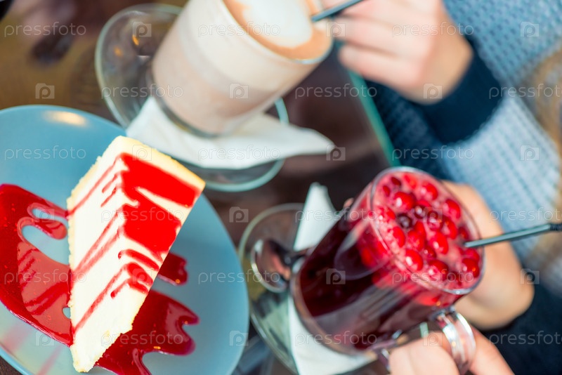 Завершение вкусного клубничного чизкейка и горячих напитков в кафе
