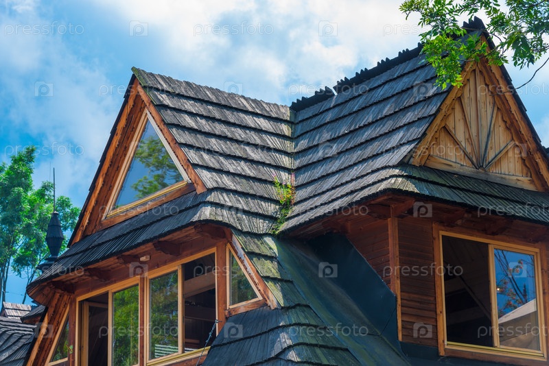 Верхний этаж деревенского дома с деревянной крышей на фоне неба крупным планом
