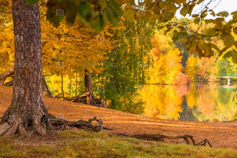 Берег озера в осеннем парке, цветная листва деревьев в солнечный день